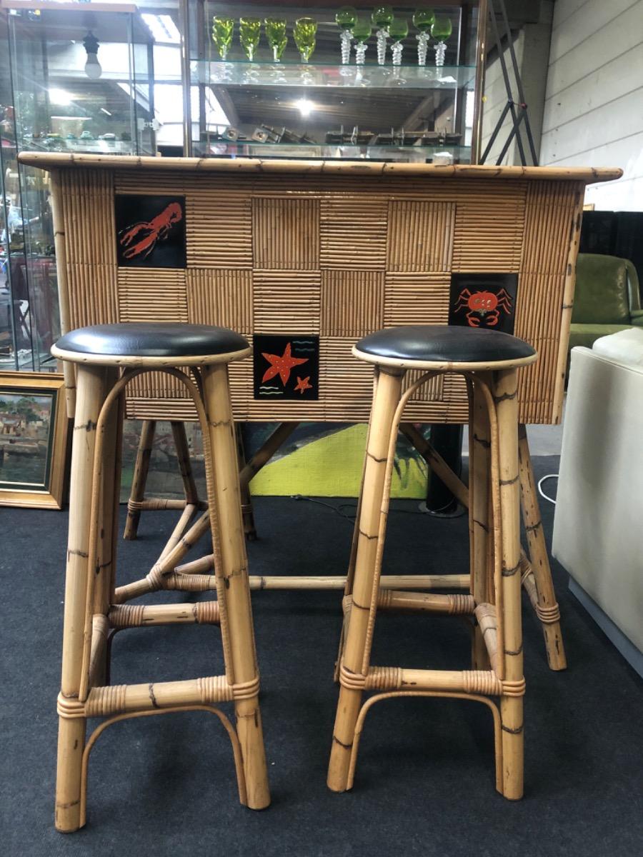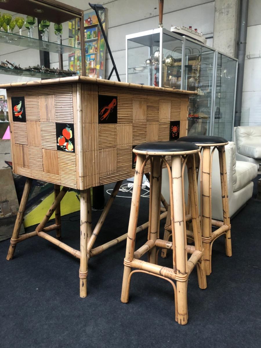 Bar vintage en rotin avec 2 tabourets attribué à Audoux & Minnet ,, ca1970, dim. 110x70x105cm , très bel état.