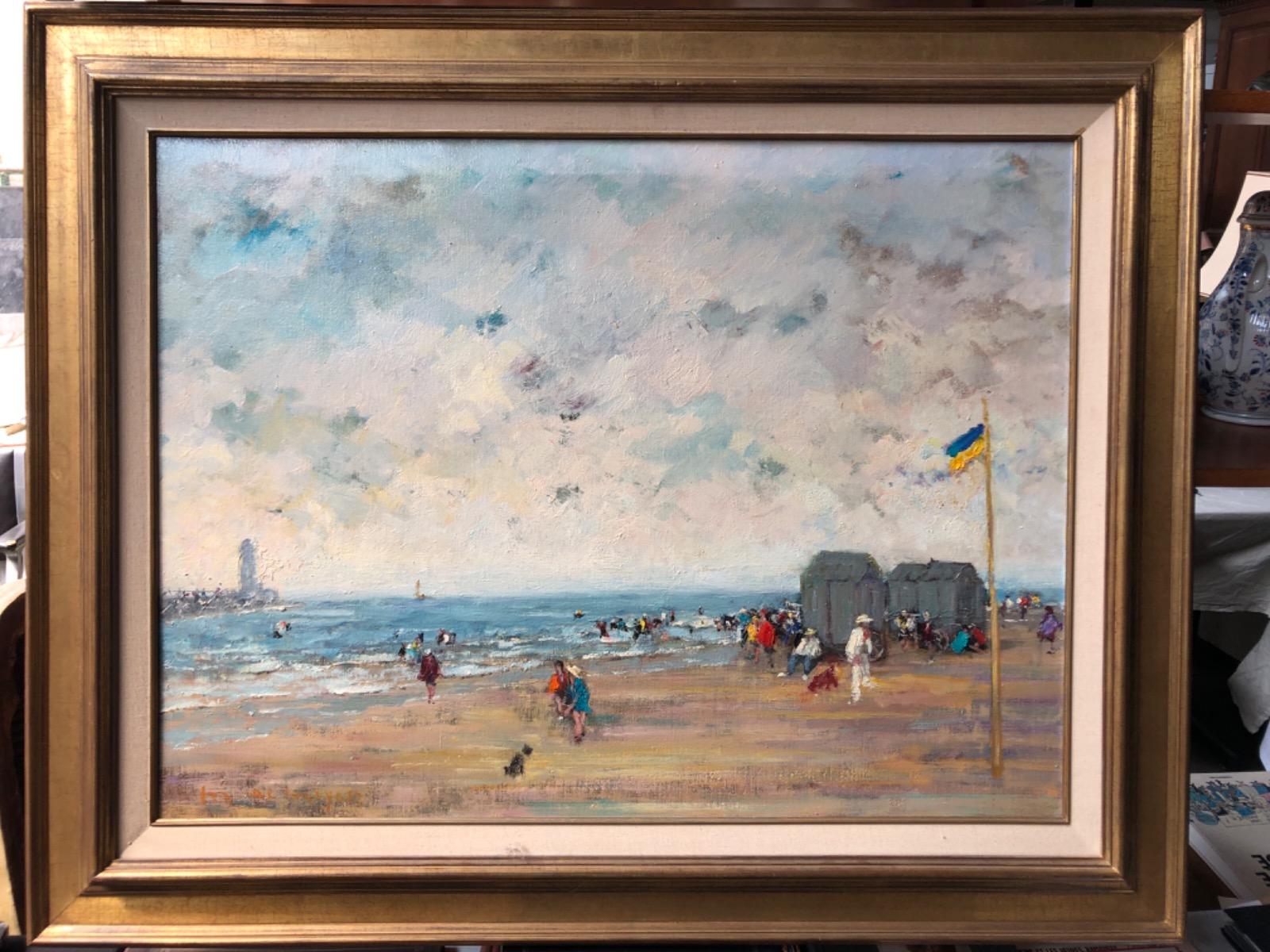 Maurice De Meyer, scène de plage en Normandie , huile sur toile, ca 1960, dim. 65x80cm, très bel état