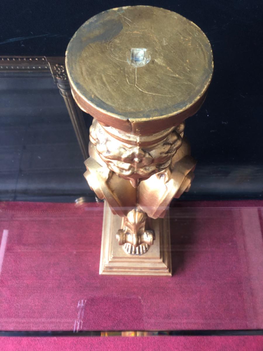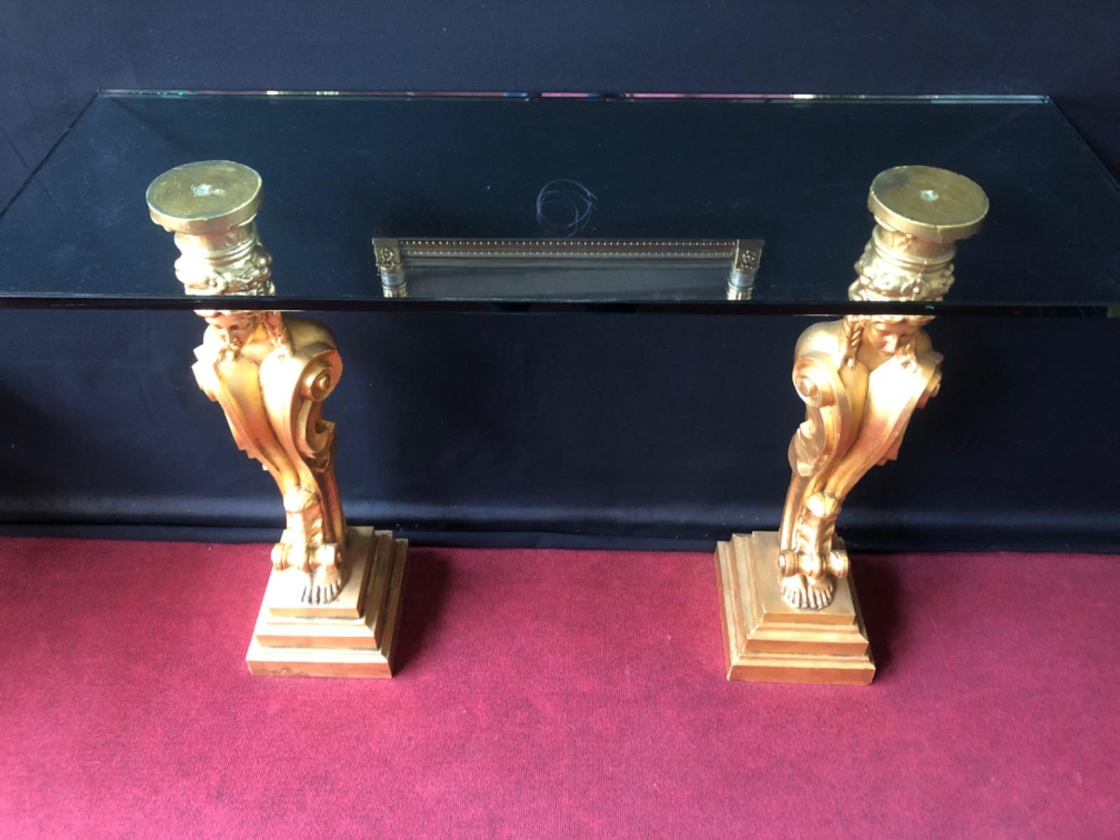 Console avec deux colonnes caryatides en platre dorée à la feuille d’or début 20 eme s avec plateau de verre fumé bizauté H 90cm plateau L120cm x 45cm