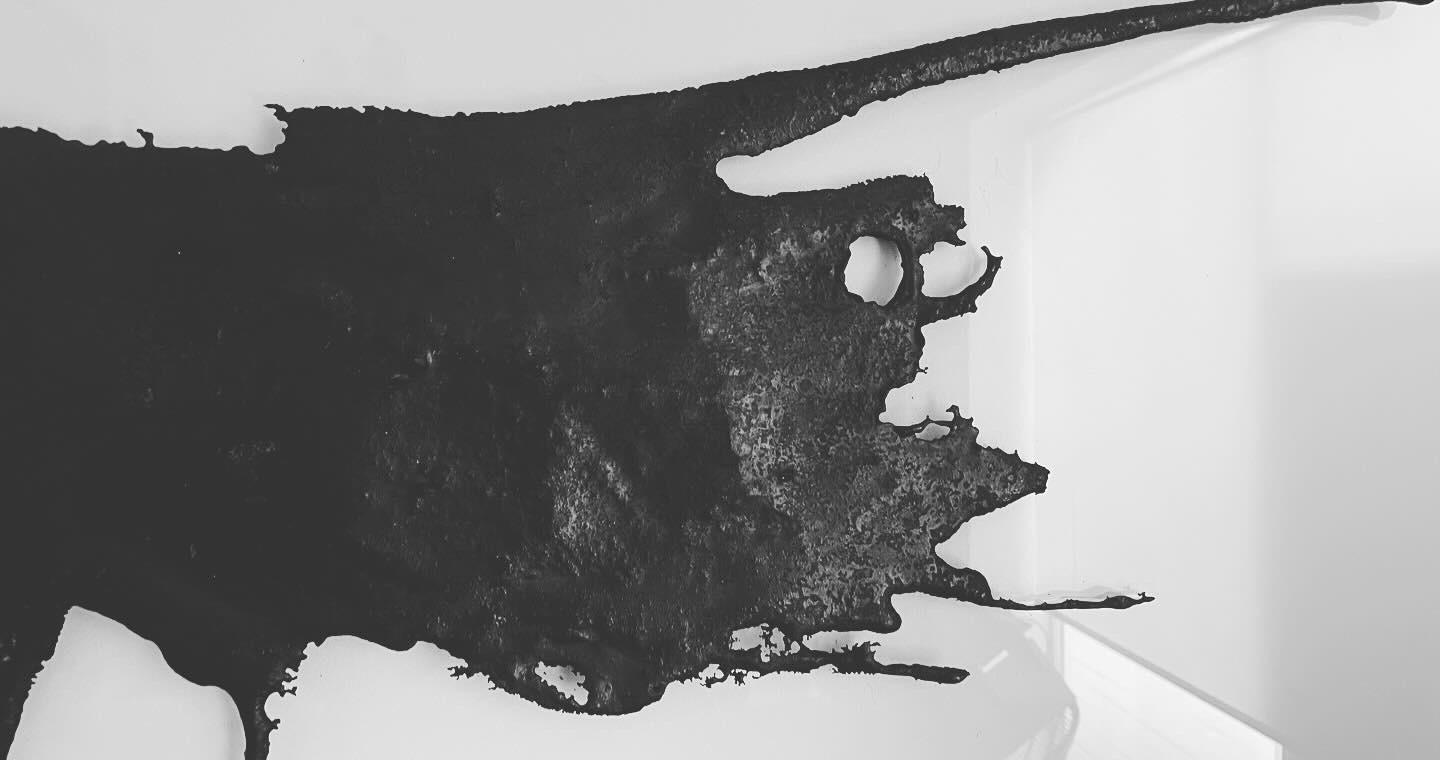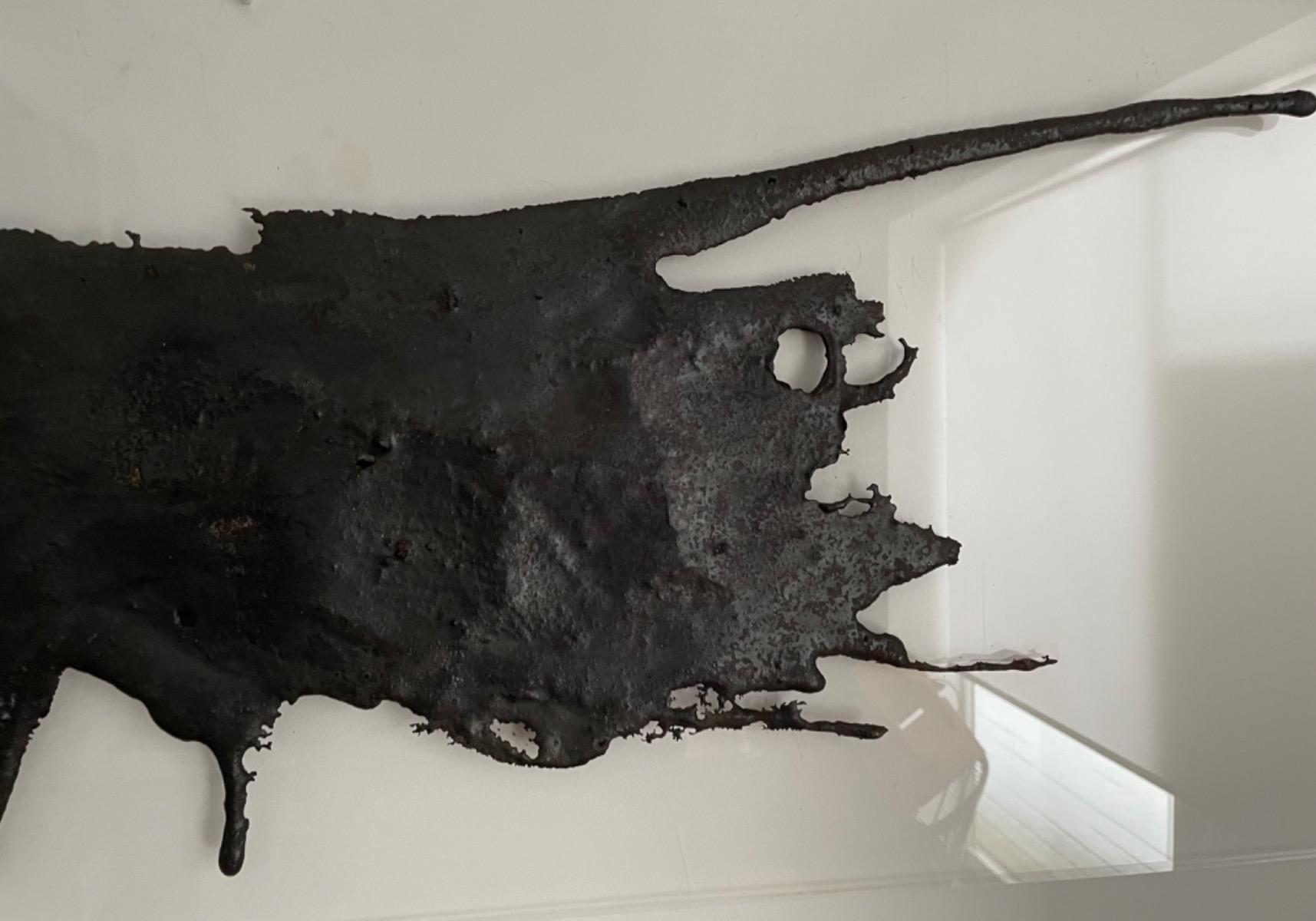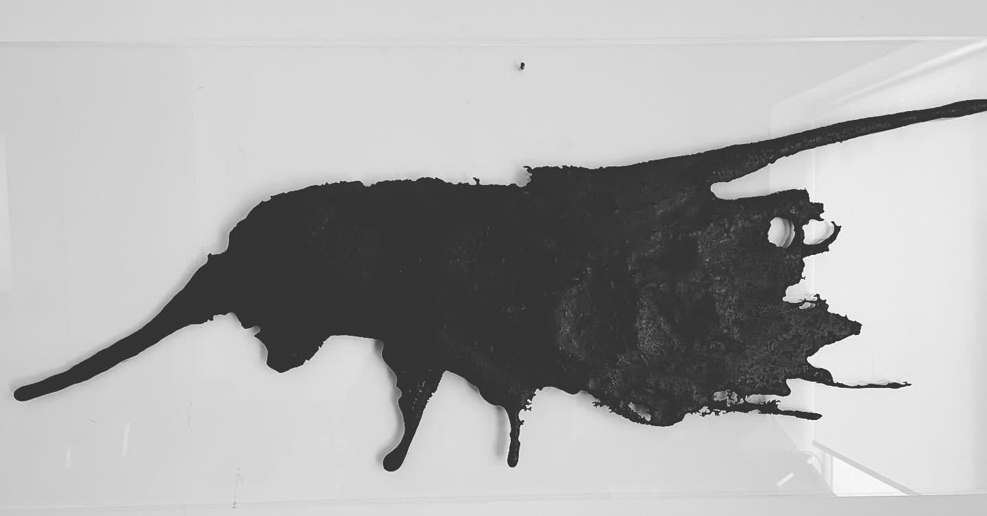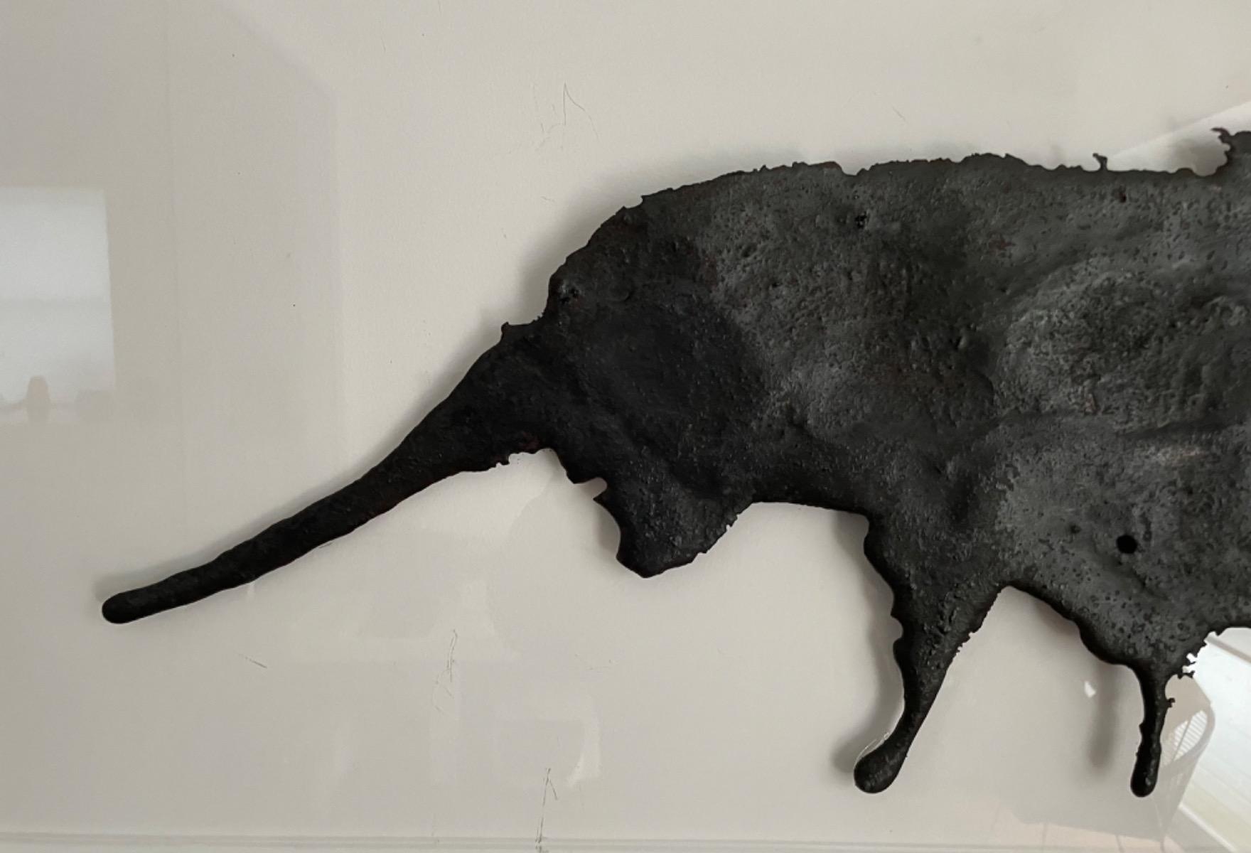 Grande sculpture zoomorphique de P. Blavier en métal montée sur plexiglass, oeuvre unique, ca. 1980, dim: 104 x 39 cm hors support.