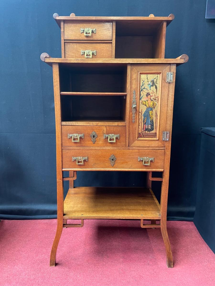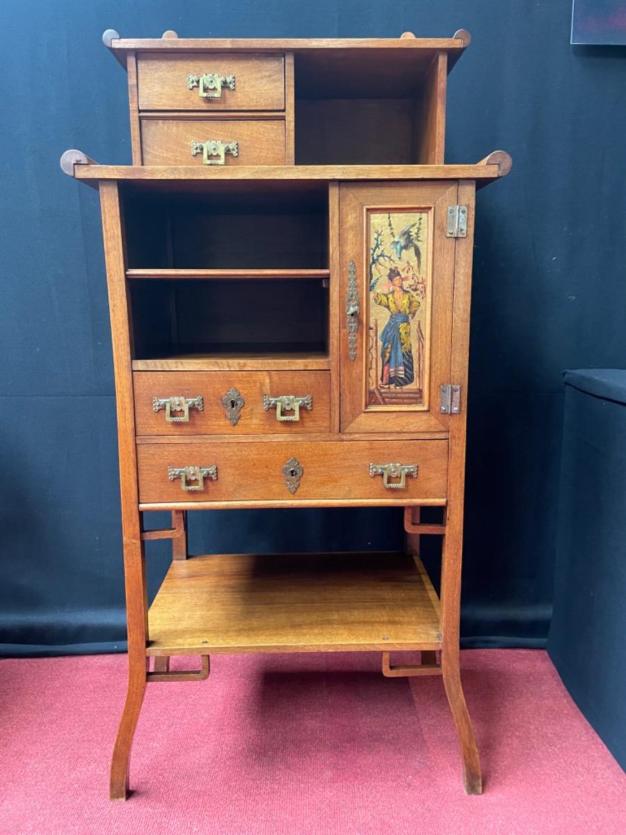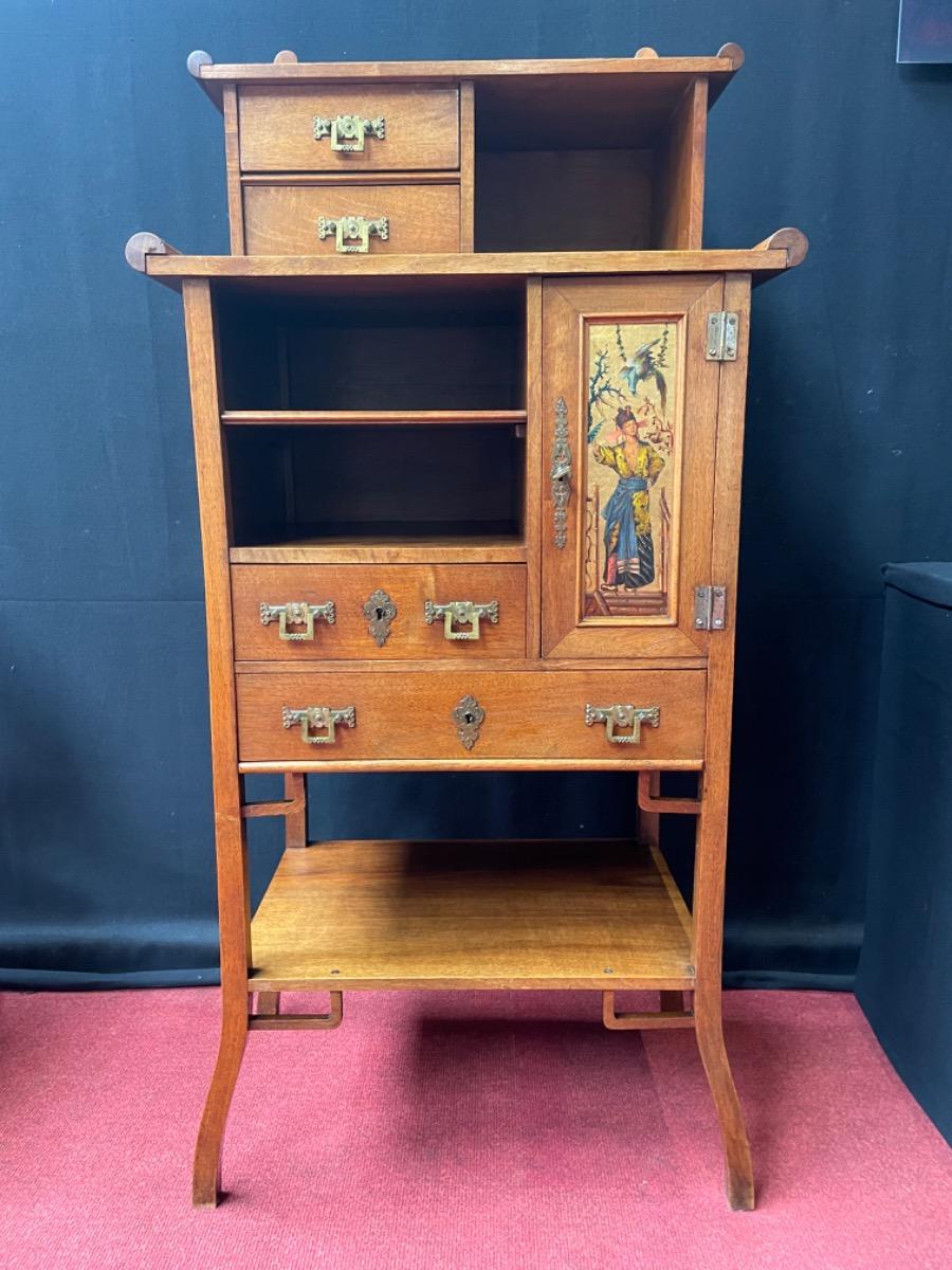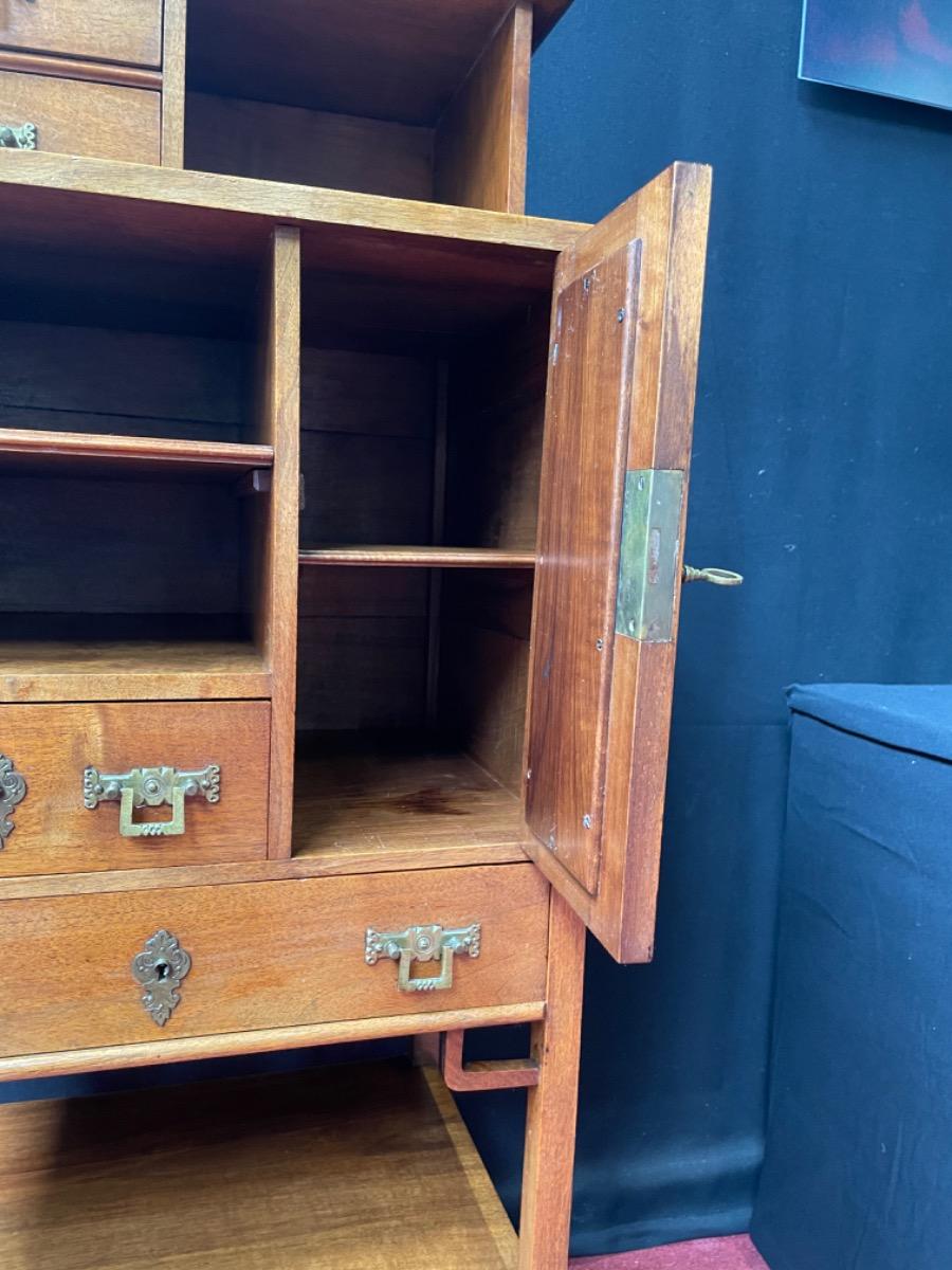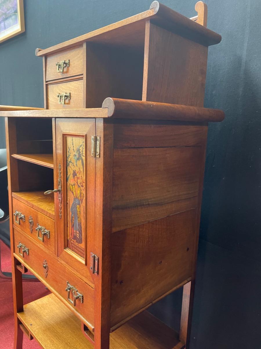 Petit cabinet en « chinoiserie » en noyer massif, décor à la feuille d’or, ca 1900, tiroirs en gradin avec galerie, dim: 119x57x37cm