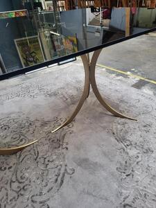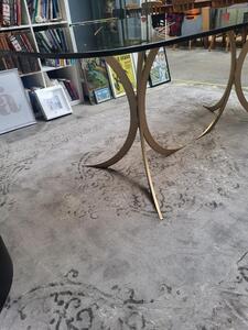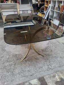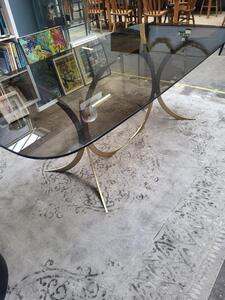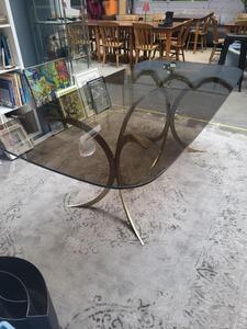 Table basse brutaliste avec socle en travertin de Willy Ballez ca 1970, dim: 152x91x36cm verre bizauté